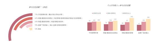 调查发现,用户对亲综艺的需求也正在变得多元化。除了节目剧情之外,明星/嘉宾的生活方式甚至品牌广告都被关注。对比个人月均收入发现,相较于整体用户,收入越高的用户群体越倾向于关注对剧情之外的元素,亲综艺对高收入人群有较强的“带货”影响力。