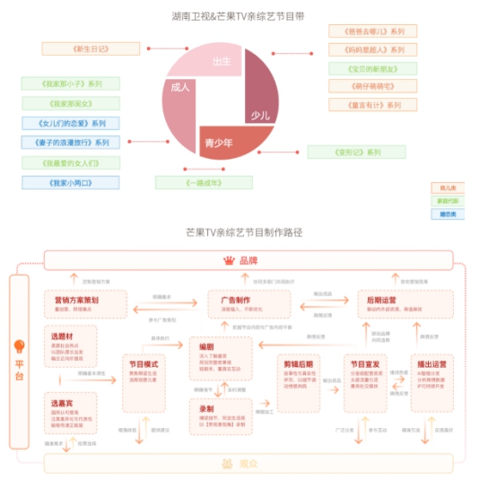 亲综艺的模式建立并非一蹴而就,而是经历了相当时间的发展与变革。从《爸爸去哪儿》播出起开辟情感观察类节目先河,而这档全新的综艺新风格,不仅创造了卫视综艺的收视神话,也启发了许多节目创作者——如何借助明星真人秀的形式,创造出更贴合观众需要、能够引发情感共鸣的综艺节目。凭借多档现象级情感观察综艺,芒果系(湖南卫视&芒果tv)在核心IP基础上建立独特的“亲综艺节目带”,不断加大竞争壁垒。